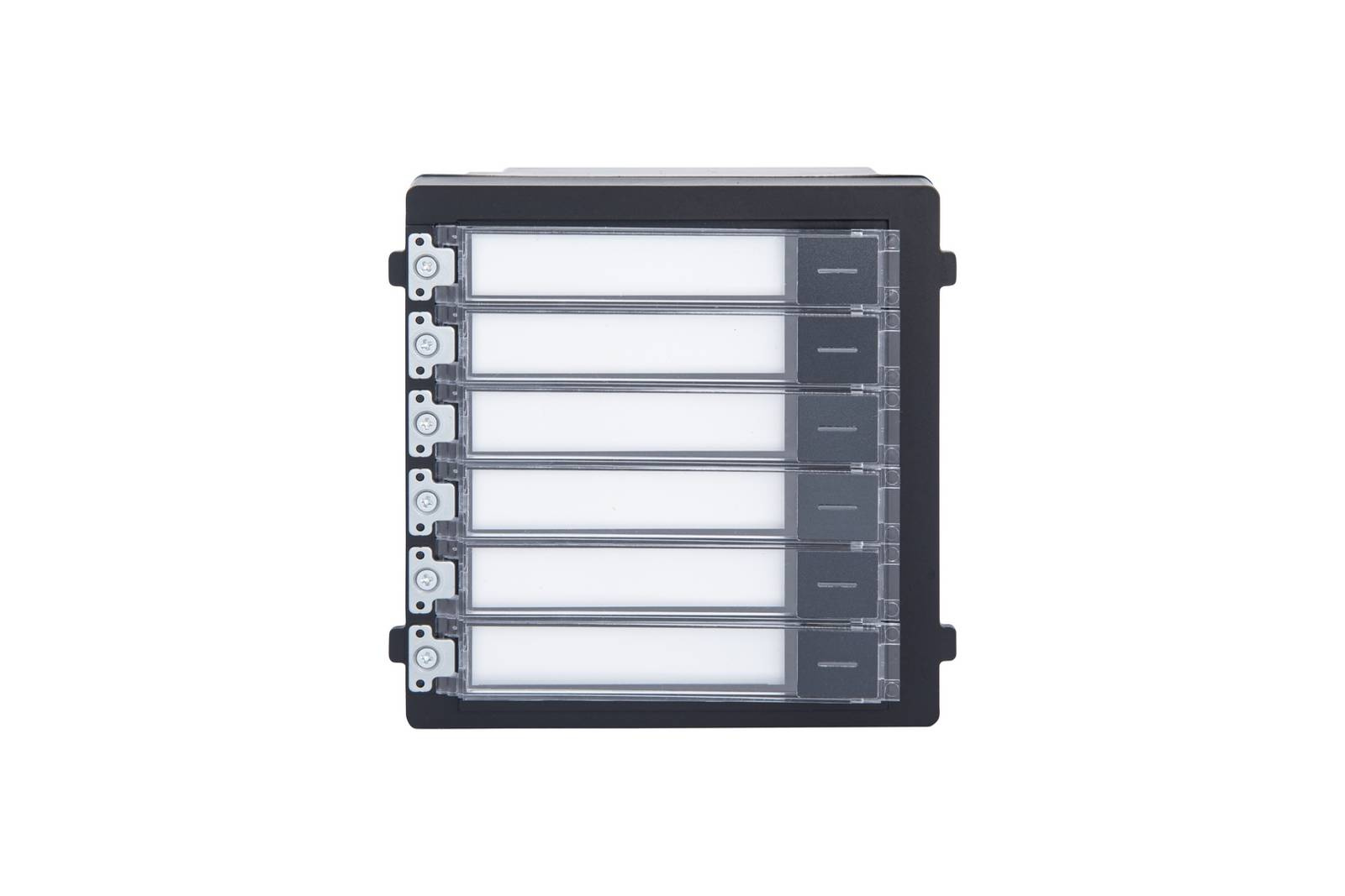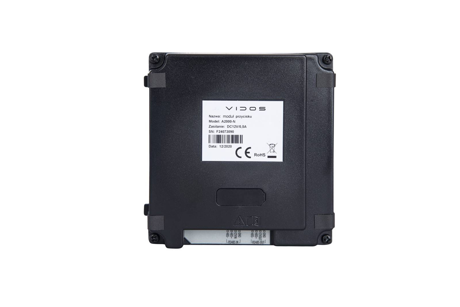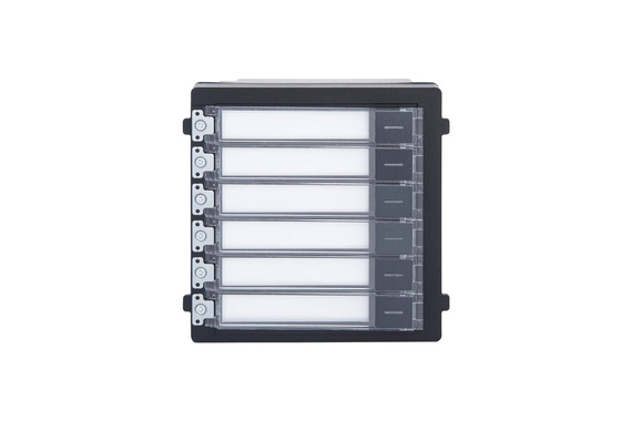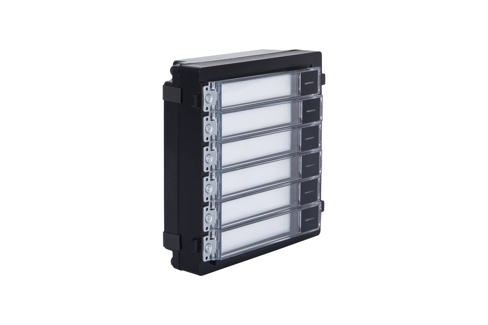 Przeznaczony do pracy w systemie Vidos ONE moduł przycisków wywołania. Wyposażony w 6 podświetlanych przycisków wraz z szyldami na nazwisko lub nazwę firmy. Wywołanie abonentów przy użyciu tego modułu odbywa się poprzez wybranie przypisanych do użytkowników przycisków. Podświetlenie LED zapewnia komfort użytkowania w warunkach niedostatecznej widoczności. A2000-N może pracować wyłącznie jako rozbudowa modułu głównego A2000-G i musi zostać zasilony przez port RS485.